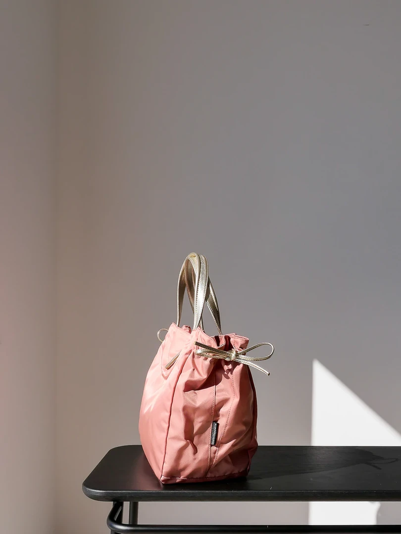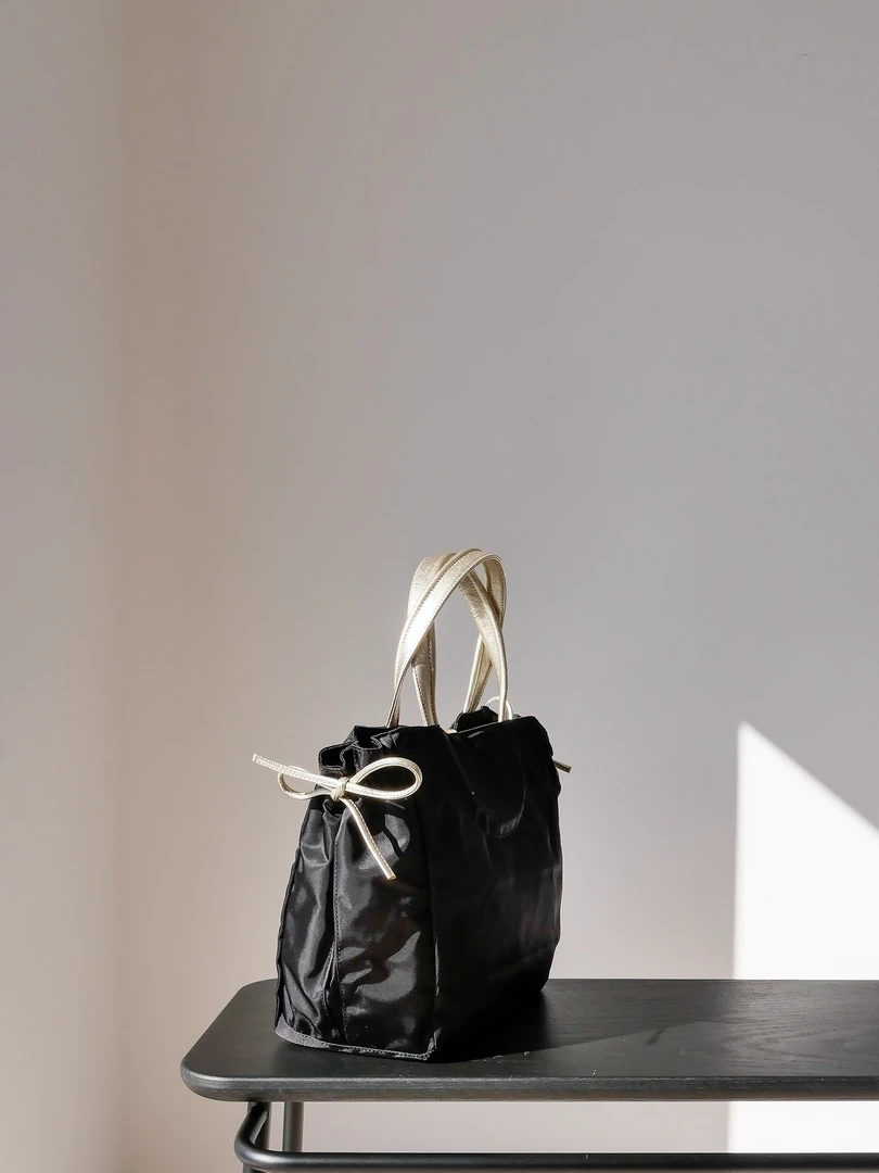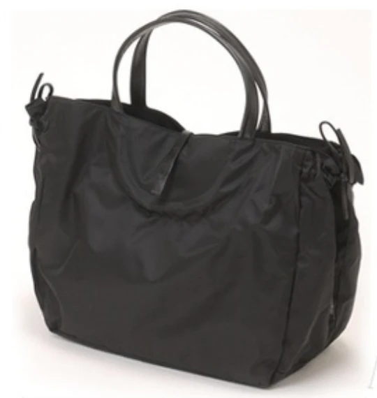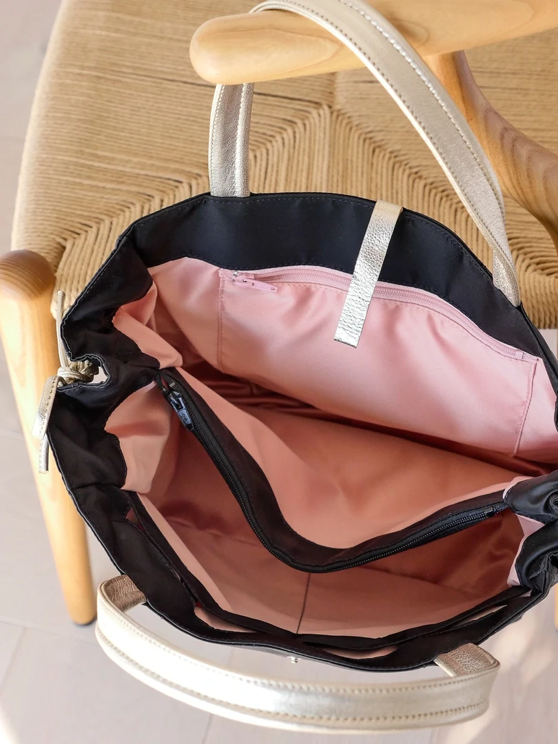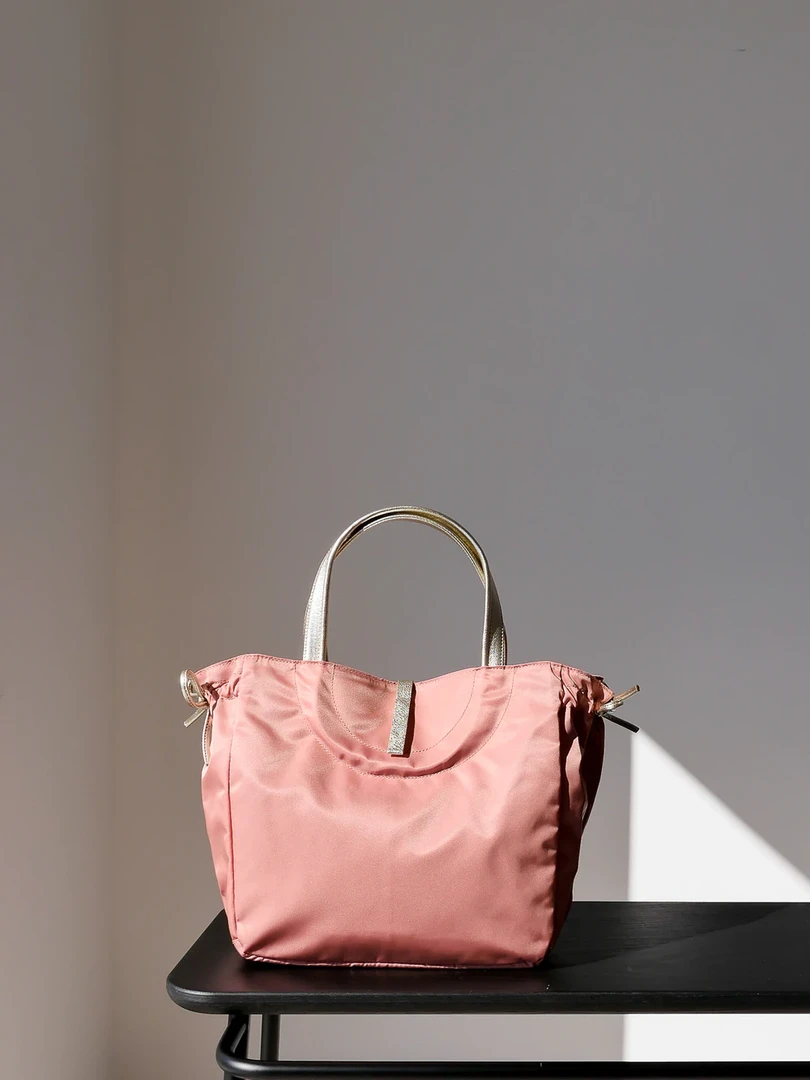 Naples emblematic tote bag, inspired by the 60’s movie “Dolce vita”, in satin nylon, rounded handles in full grain leather, light, with separation pocket and inside zipped pocket, handy. Bag expands lengthwise by about 2-3″ by undoing and retying leather straps on the side.