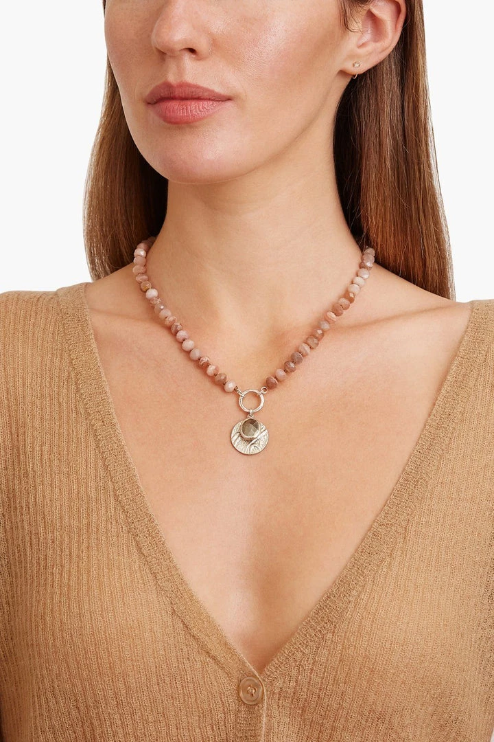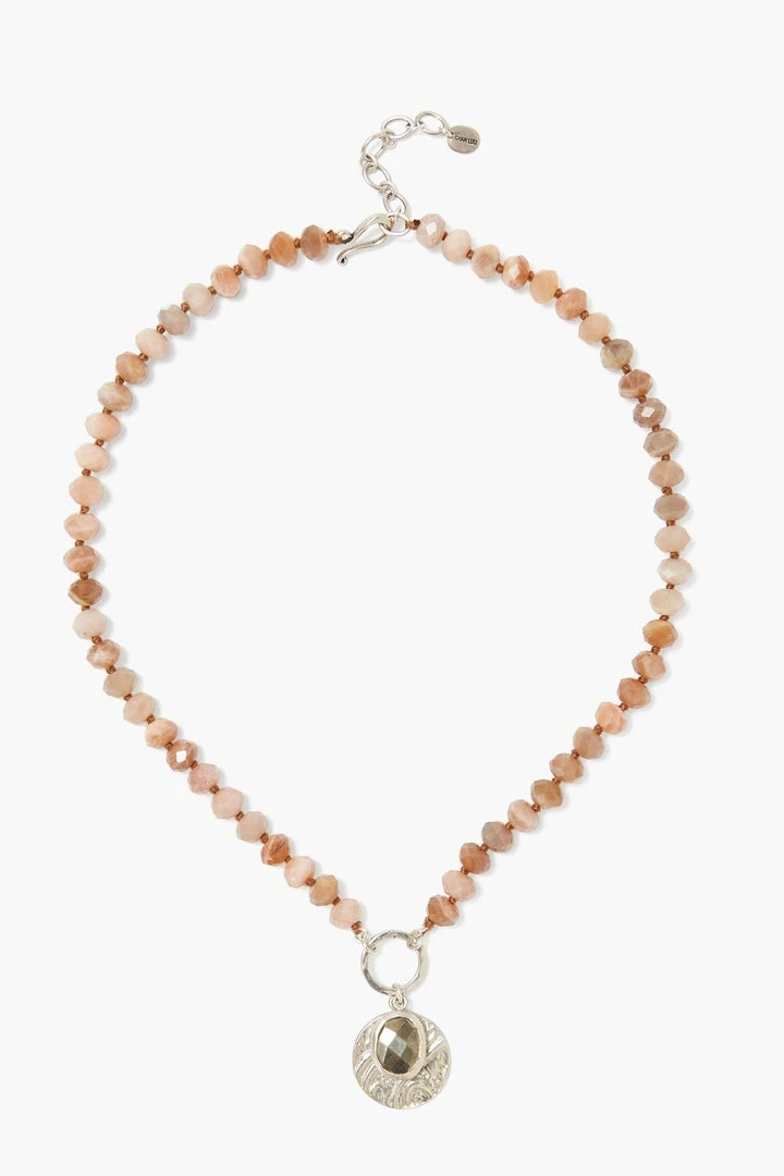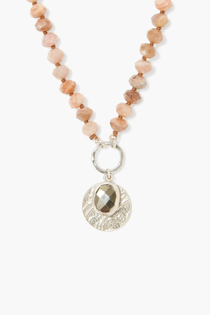 Ethereal and full of light, this short necklace features a luminous bezel set pyrite nugget and etched silver coin charm suspended from sunstone rondelles. Fastens with a sterling silver hook clasp.