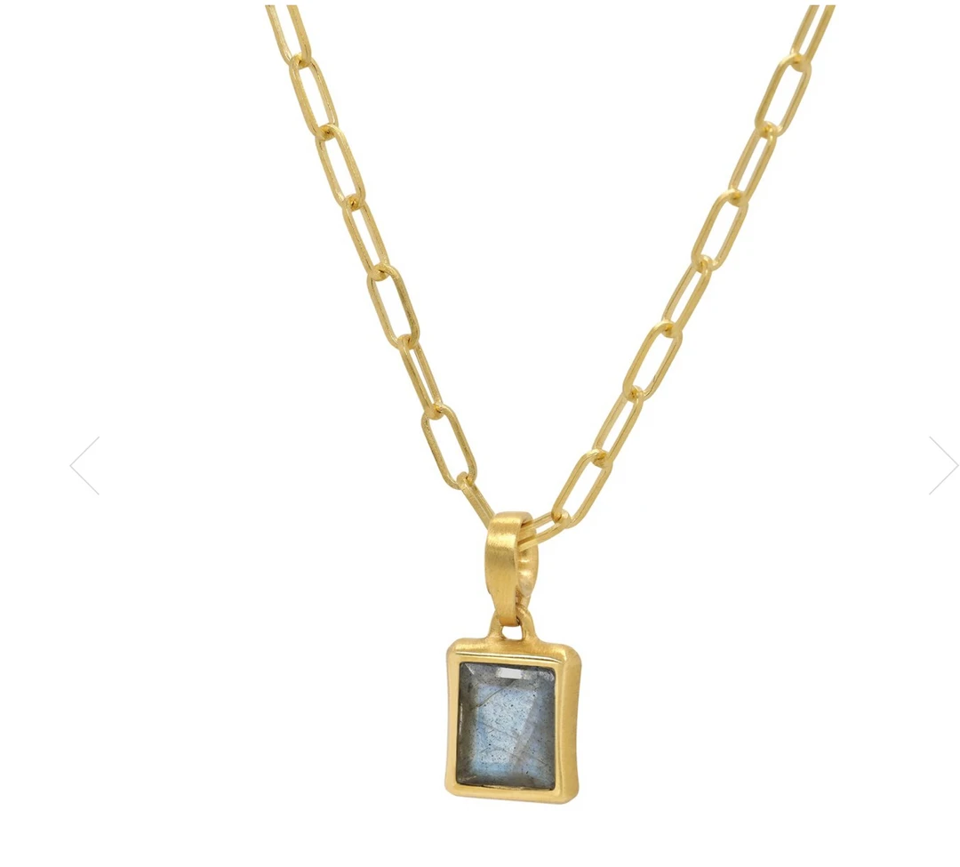 The Signature Layered Necklace features a multi-faceted, brilliant-cut gemstone paired with brushed gold disc, both suspended on a fluid box chain and secured with a DD toggle.
