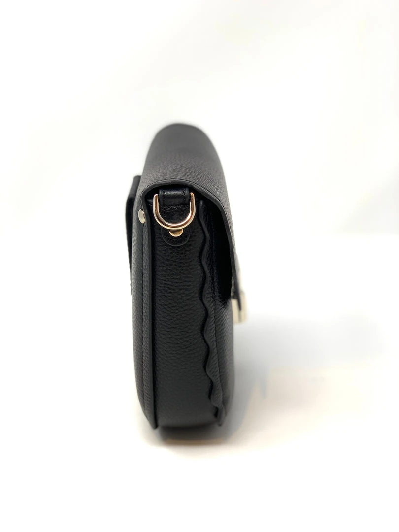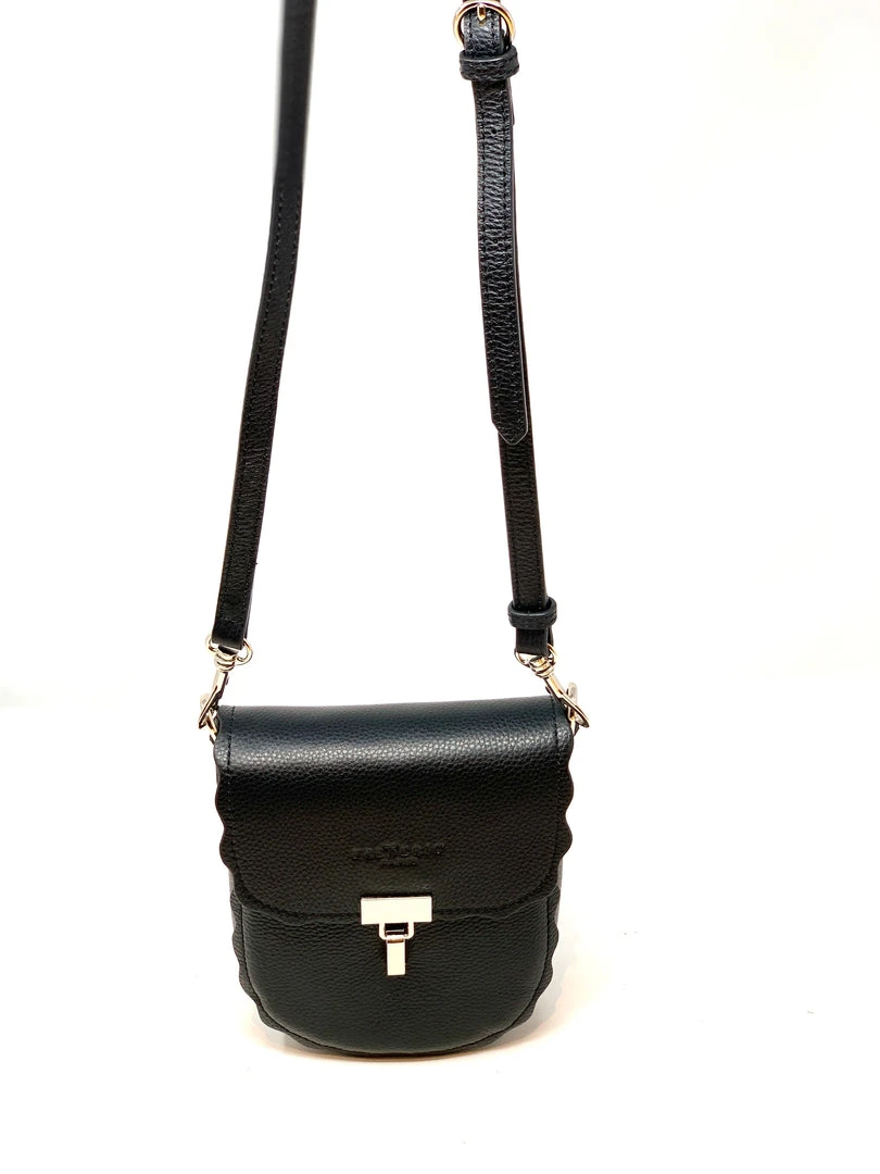 A small feminine belt bag for your essentials that can be worn around the waist on a substantial 1” wide belt (included) or across the body on a slim shoulder strap. Closes securely with a metal turn lock.
