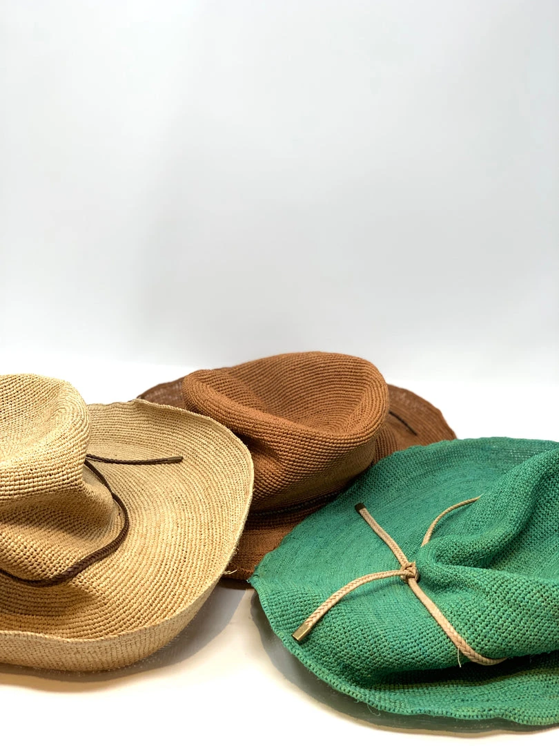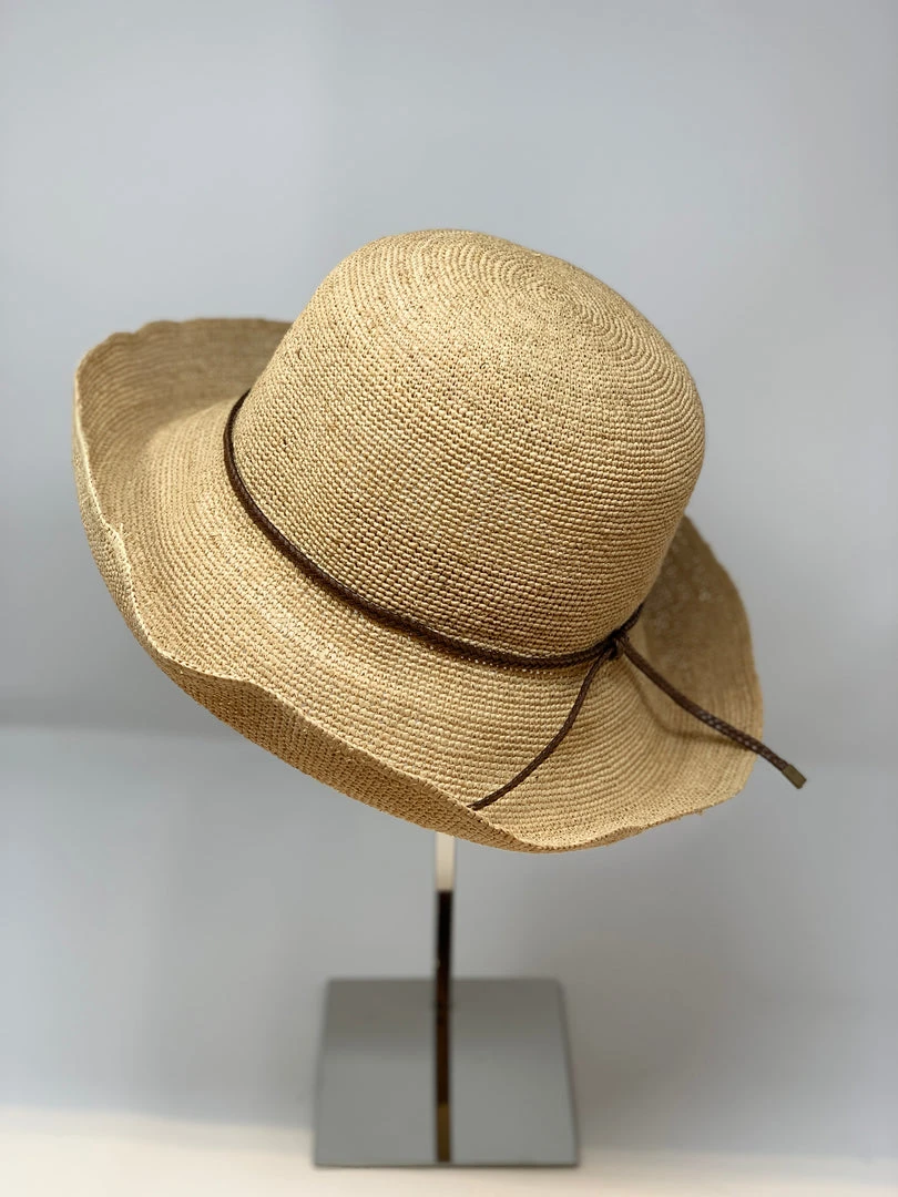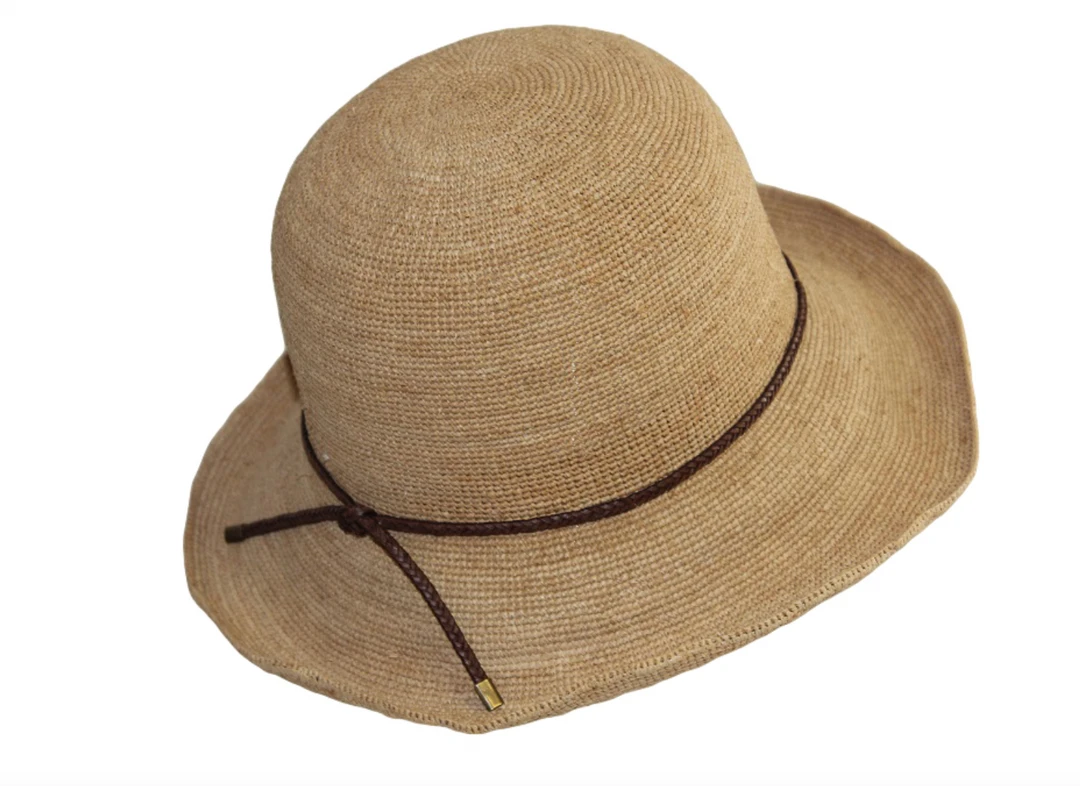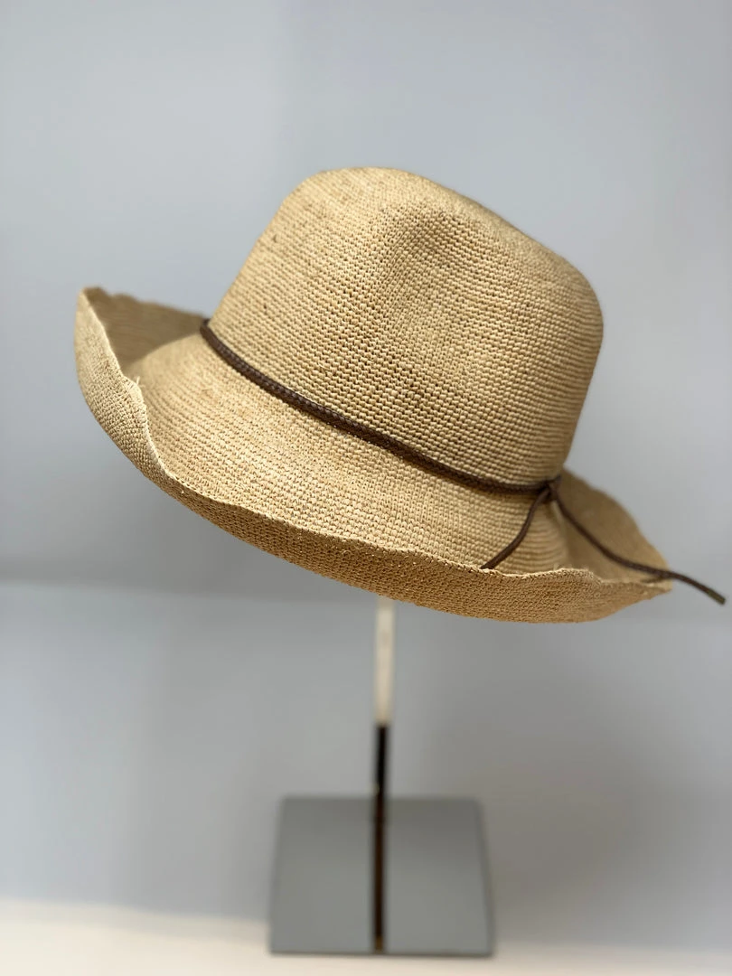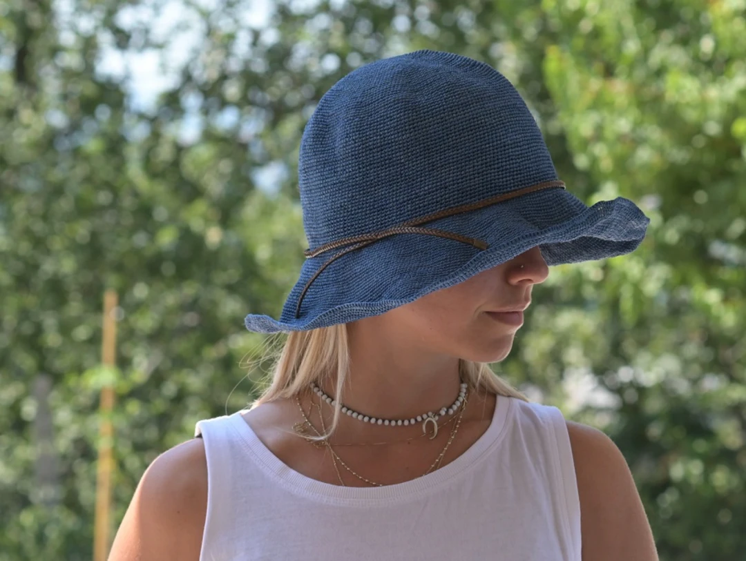 Lightly wired asymmetrical 5″ brim and flexible crown make this hat flattering on any face shape. Designed to be folded in half for easy packing.