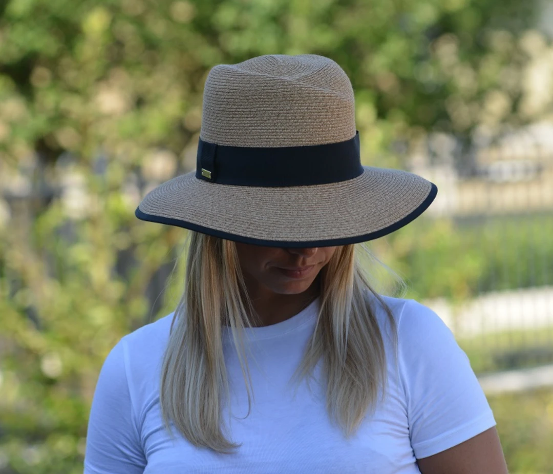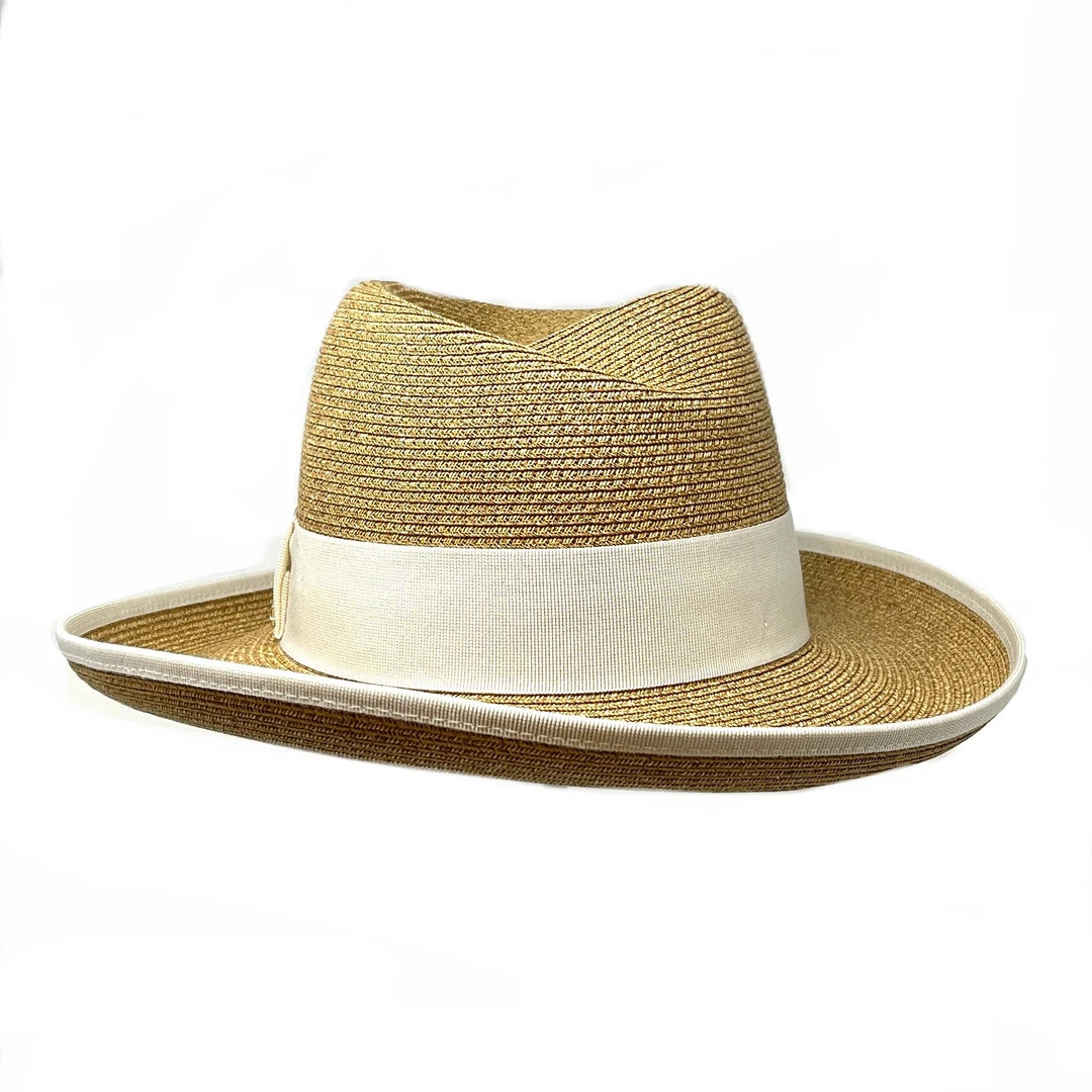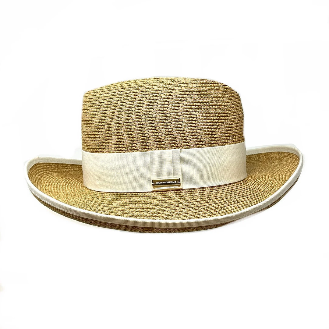 3.5″ brim, 4.5″ Crown. Wired Brim is trimmed with same ribbon fabric as crown.