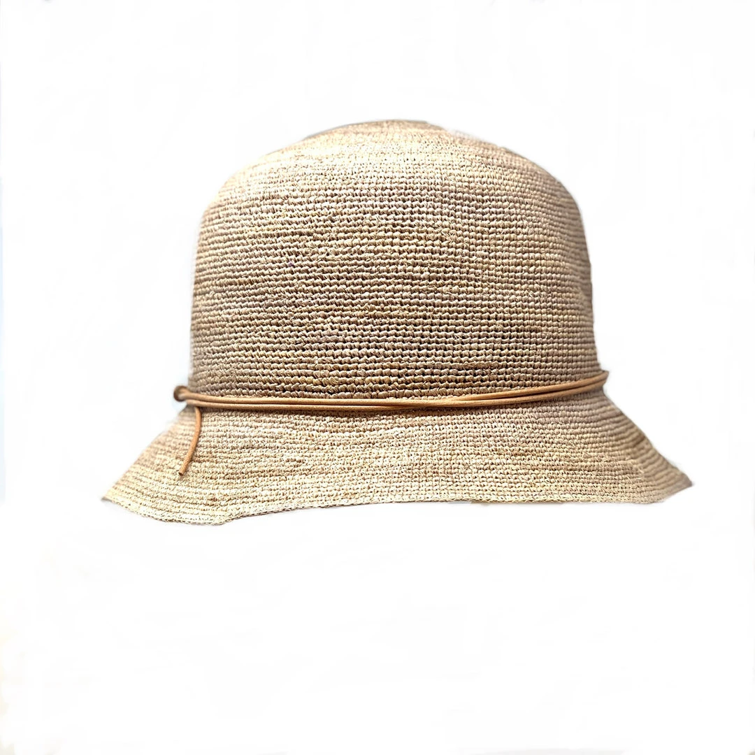 Raffia Hat made from uniquely textured weave pattern. Interior band hides an adjustor with velcro closure that easily tightens or loosens the hat 1 size.Â