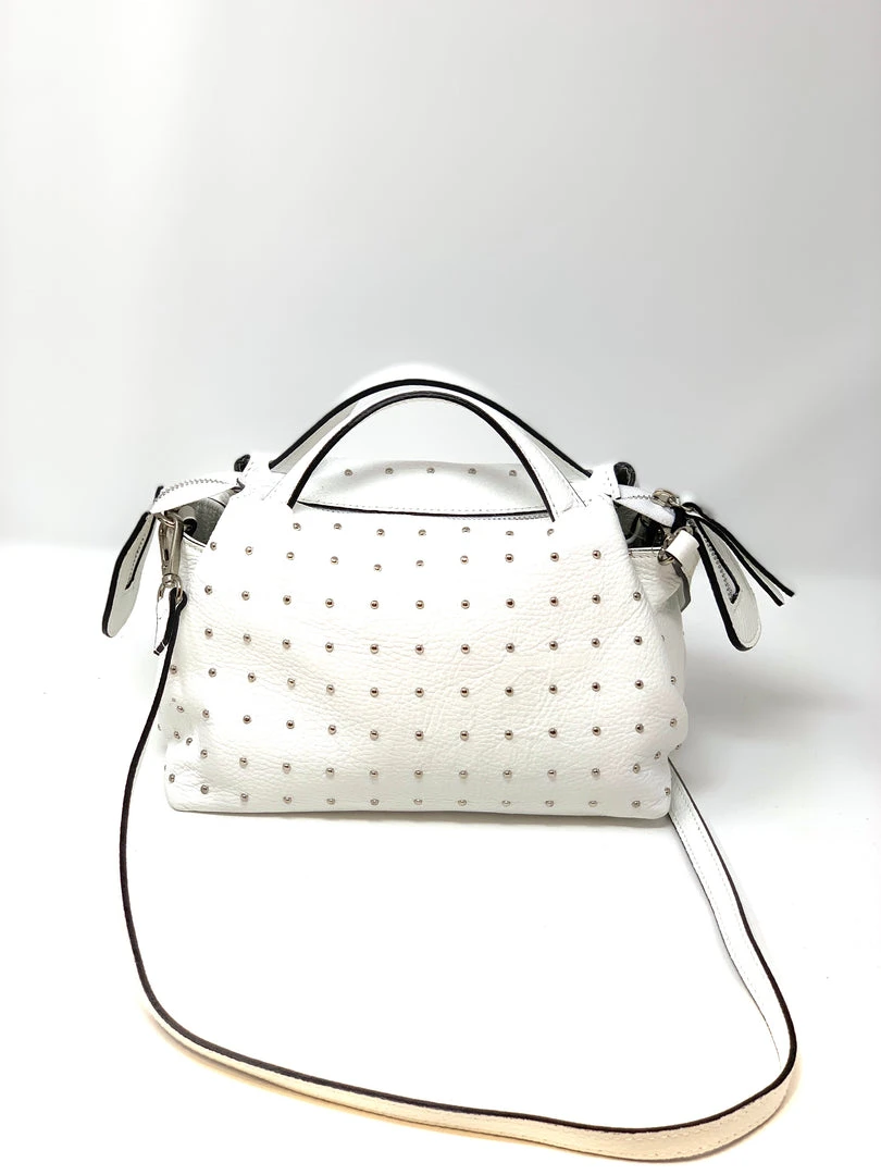 White pebble leather with silver studded accents. Roomy design makes this a versatile day to night bag.