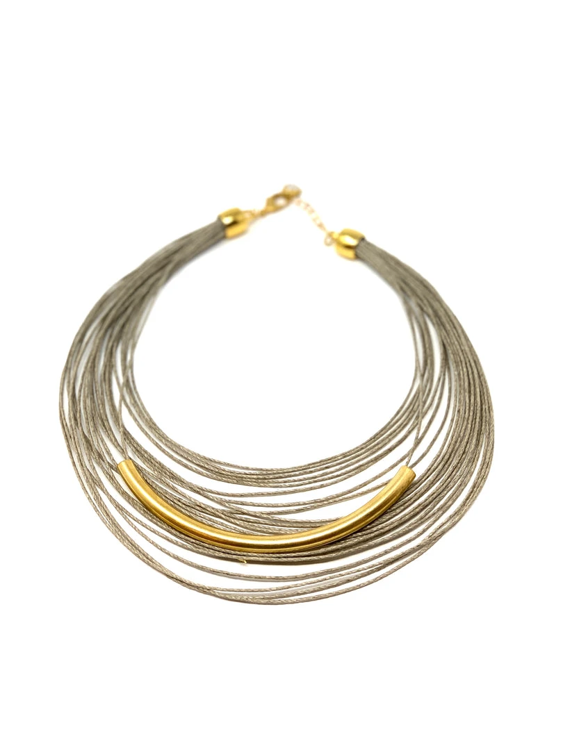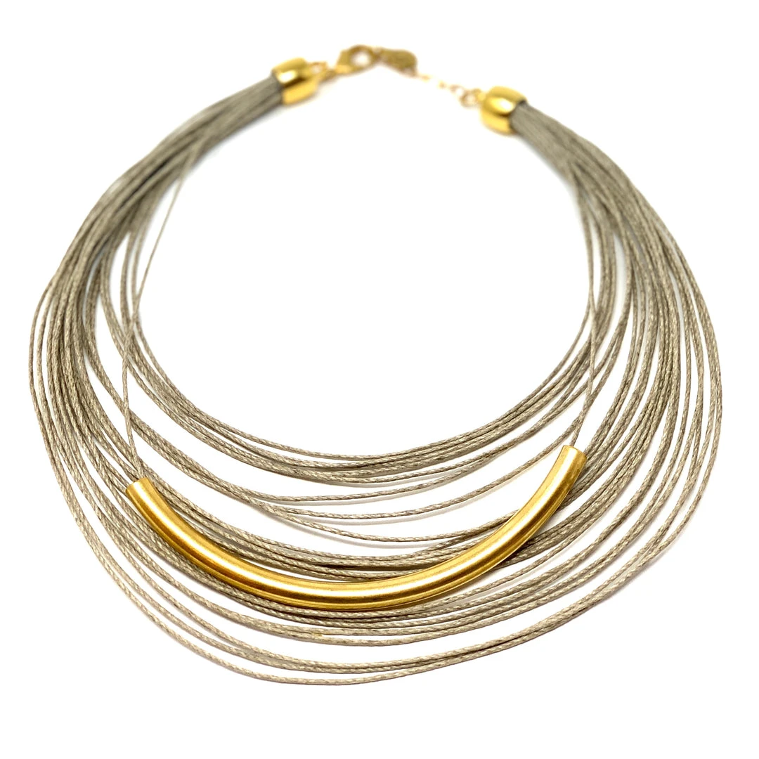 A necklace fit for a goddess. Thin hemp cords in a natural beige flecked with 5″ long gently arched 24K yellow gold-plated brass rod.