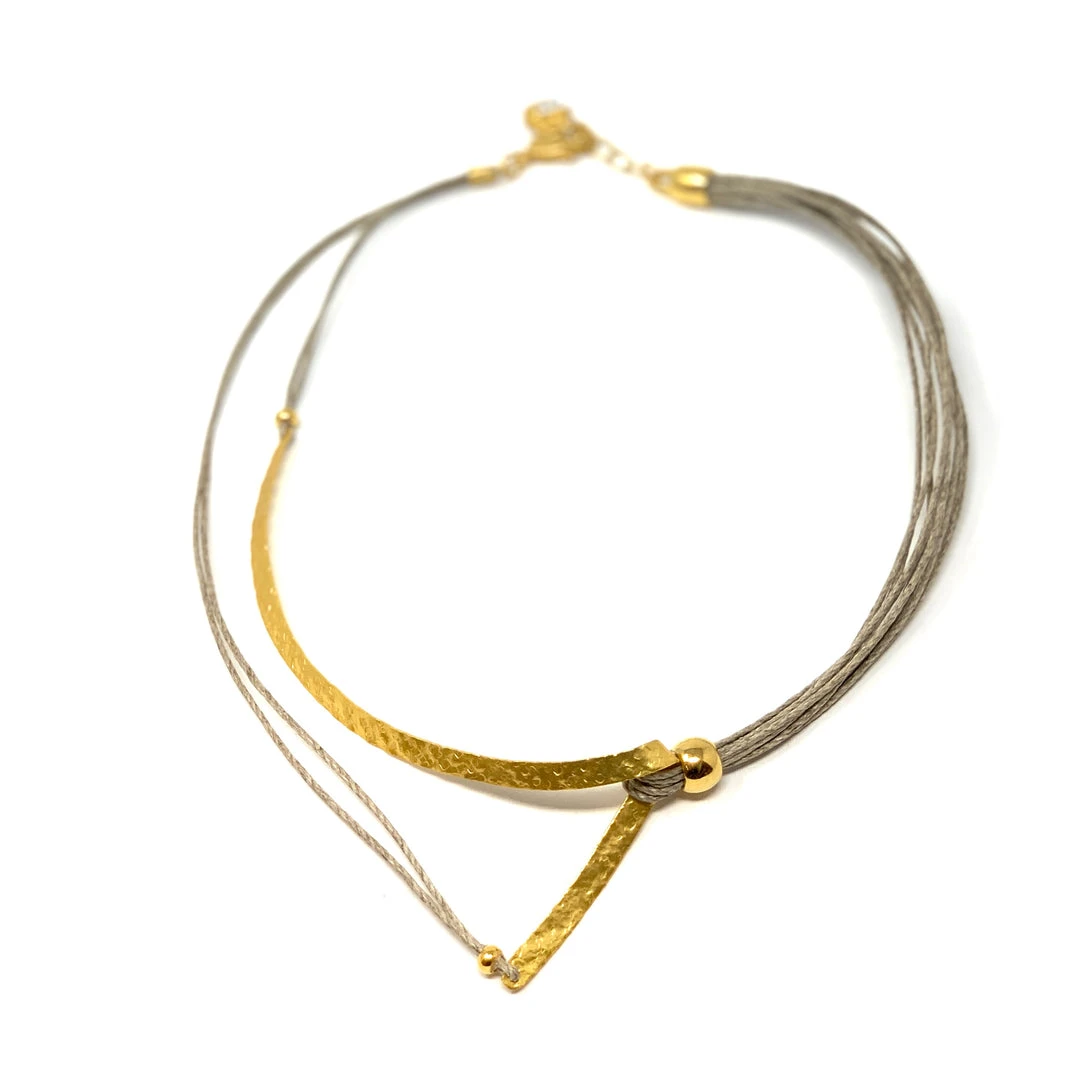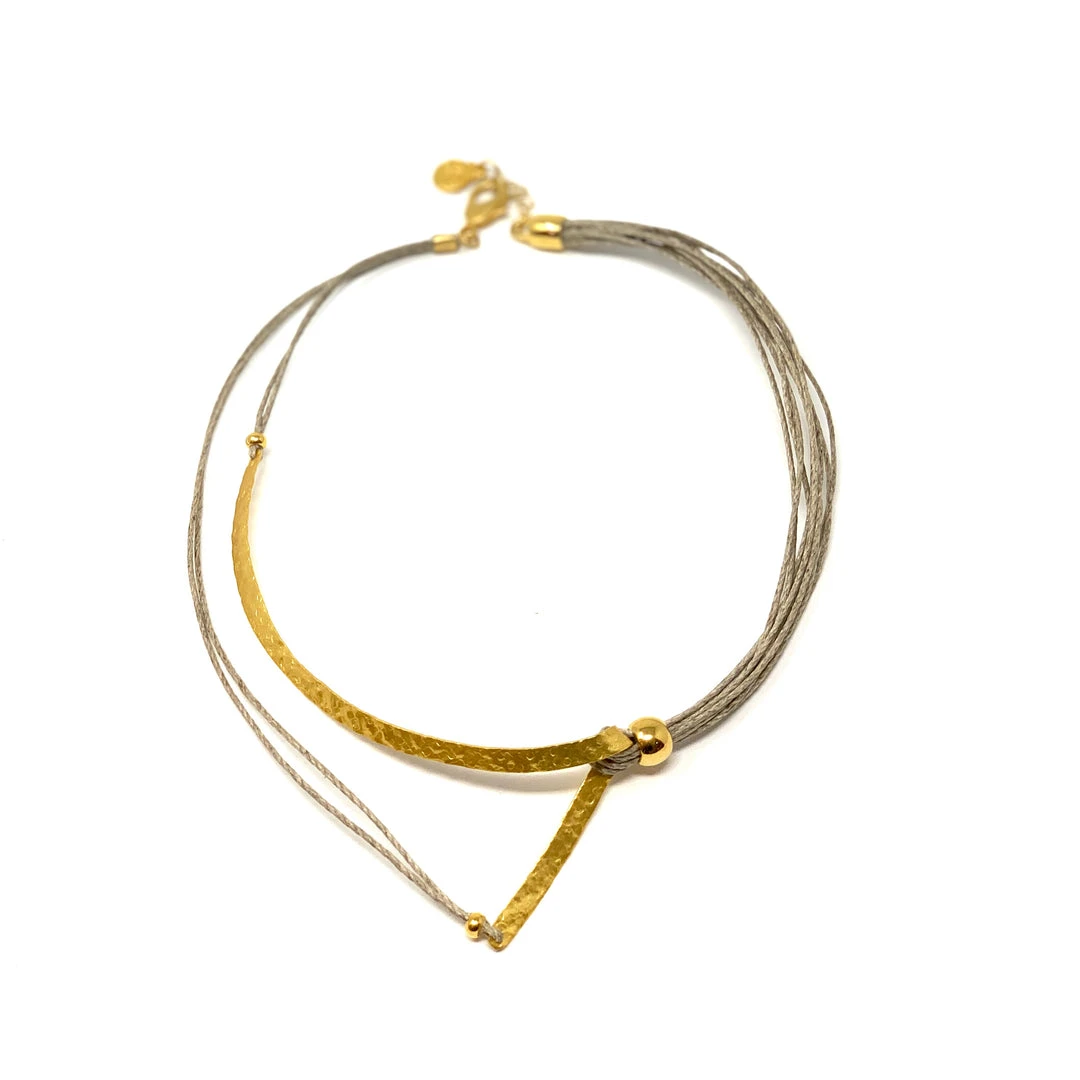 A necklace fit for a goddess. Thin hemp cords in a natural beige flecked with 5″ torqued, hand-hammered 24K yellow gold-plated brass arch.