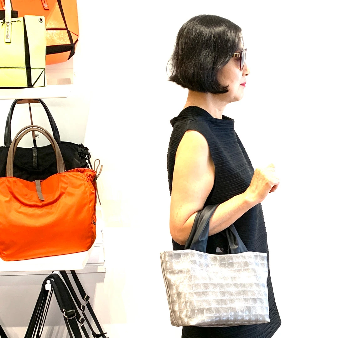 This small sleek handlheld tote has soft, comfortable handles made of rubber sheeting. The body of the bag is made from a unique holographic fabric that is upcycled, waterproof, scratch-proof, indoor/outdoor upholstery fabric. The top can be tucked in and held down by magnet snap to transform the tote into a mini satchel shape. The material holds it shape and stands upright on its own. Magnet snap closure.