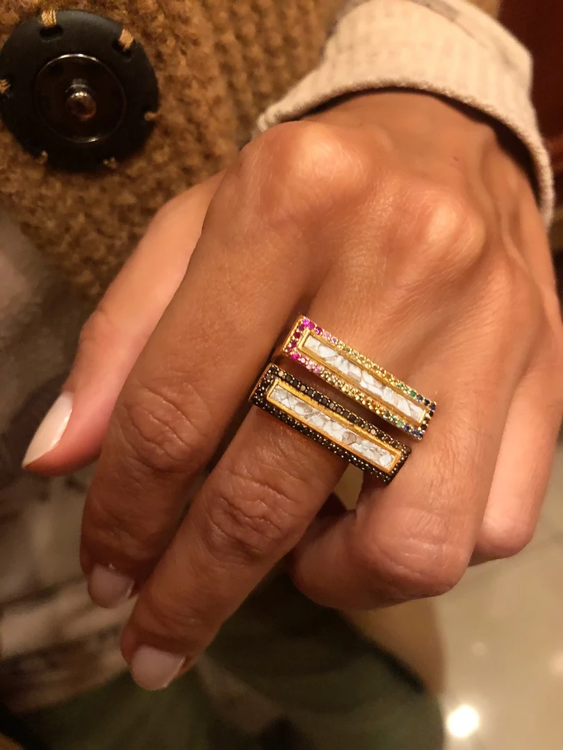 Sliced raw uncut diamonds, White resin, Pave black diamonds, Vermeil 18k gold