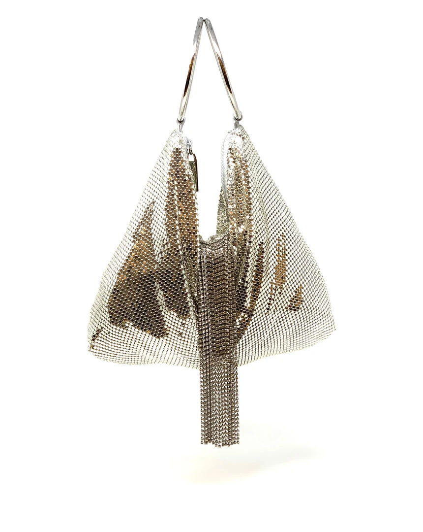 Glamorous Whiting & Davis ball fringe bracelet bag is the perfect go to bag for any time of day. This vintage inspired metal-mesh crystal fringe handbag is an eye catching accessory. Can be dressed up for a cocktail party or wedding or down for an afternoon out with friends. The double-ring handles add a glamorous touch around your wrist while keeping your hands free for hors d’oeuvers and cocktails.